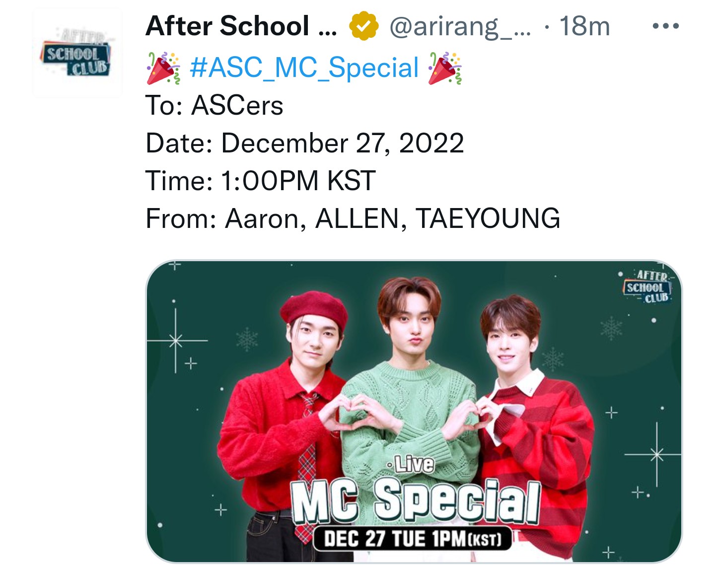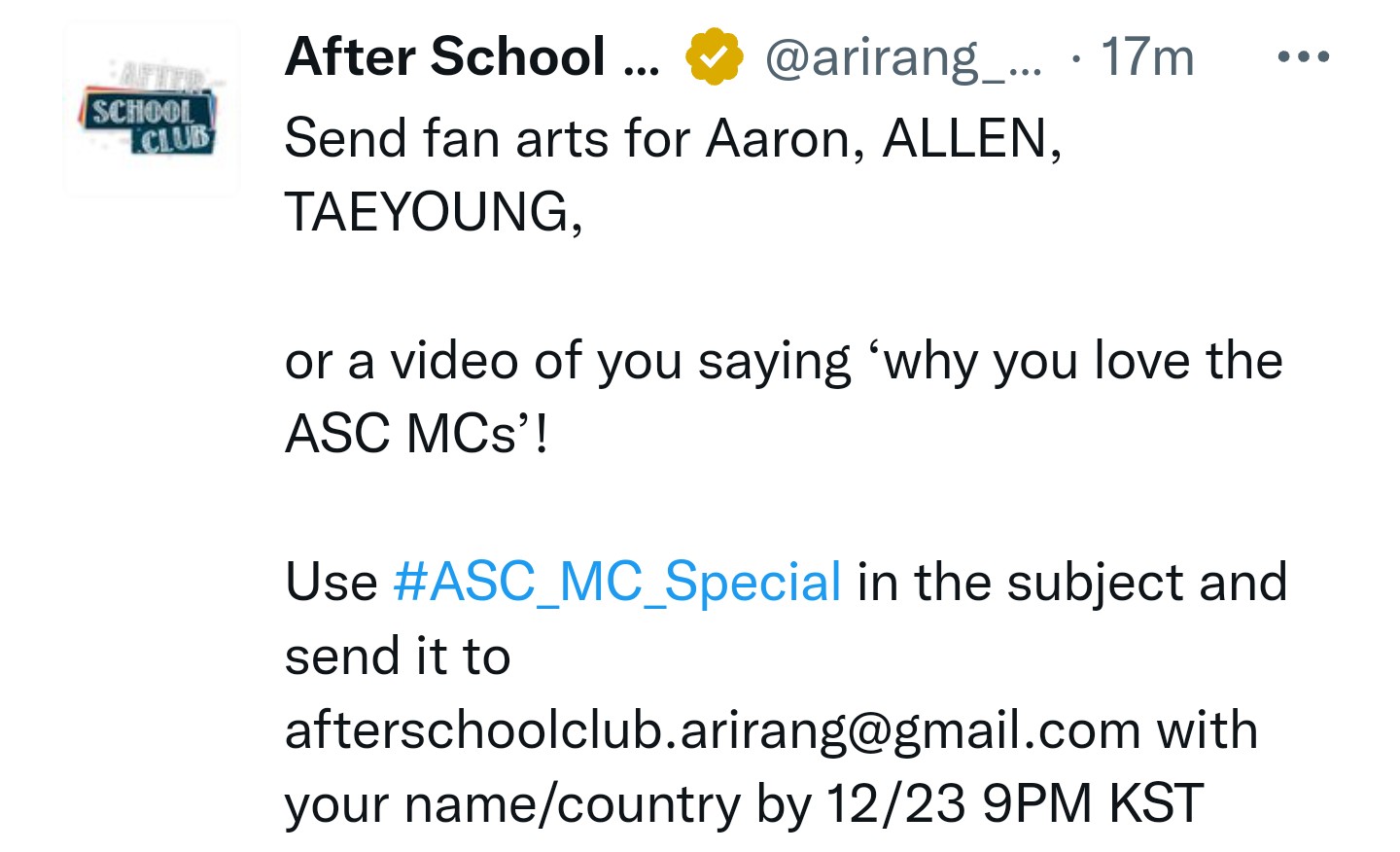 Use #ASC_MC_Special in the subject and send it to afterschoolclub.arirang@gmail.com with your name/country by 12/23 9PM KST