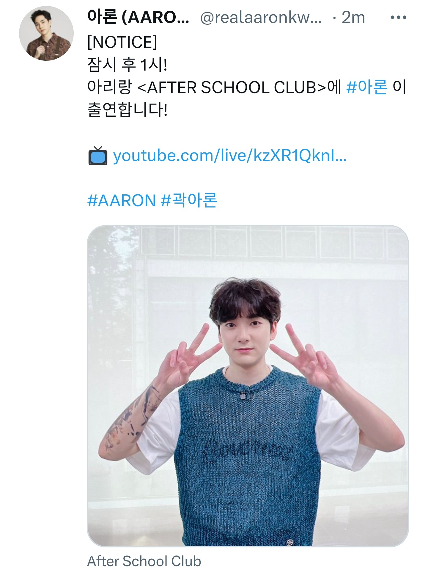 아리랑 <AFTER SCHOOL CLUB>에 #아론 이 출연합니다!