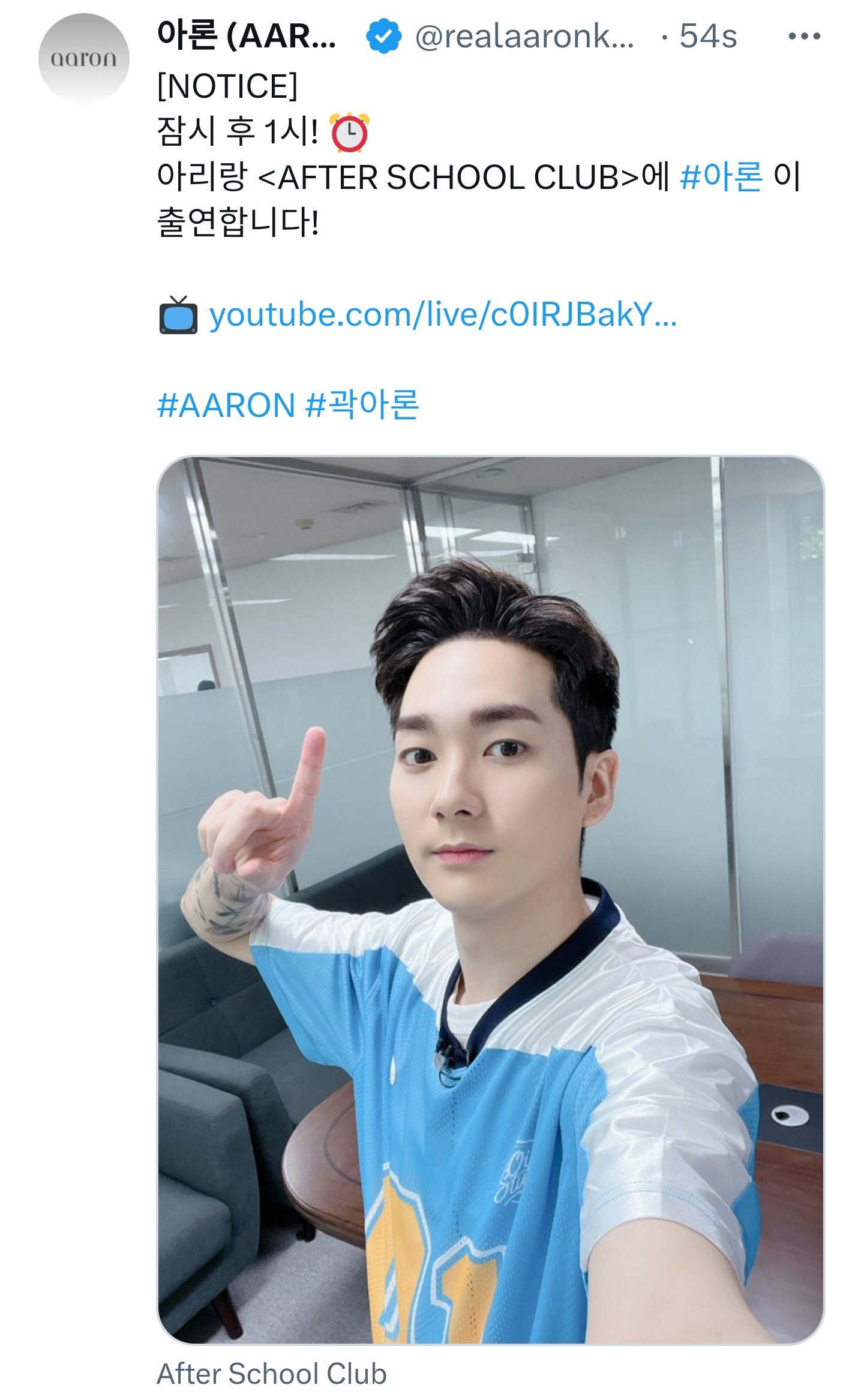 아리랑 <AFTER SCHOOL CLUB>에 #아론 이 출연합니다!