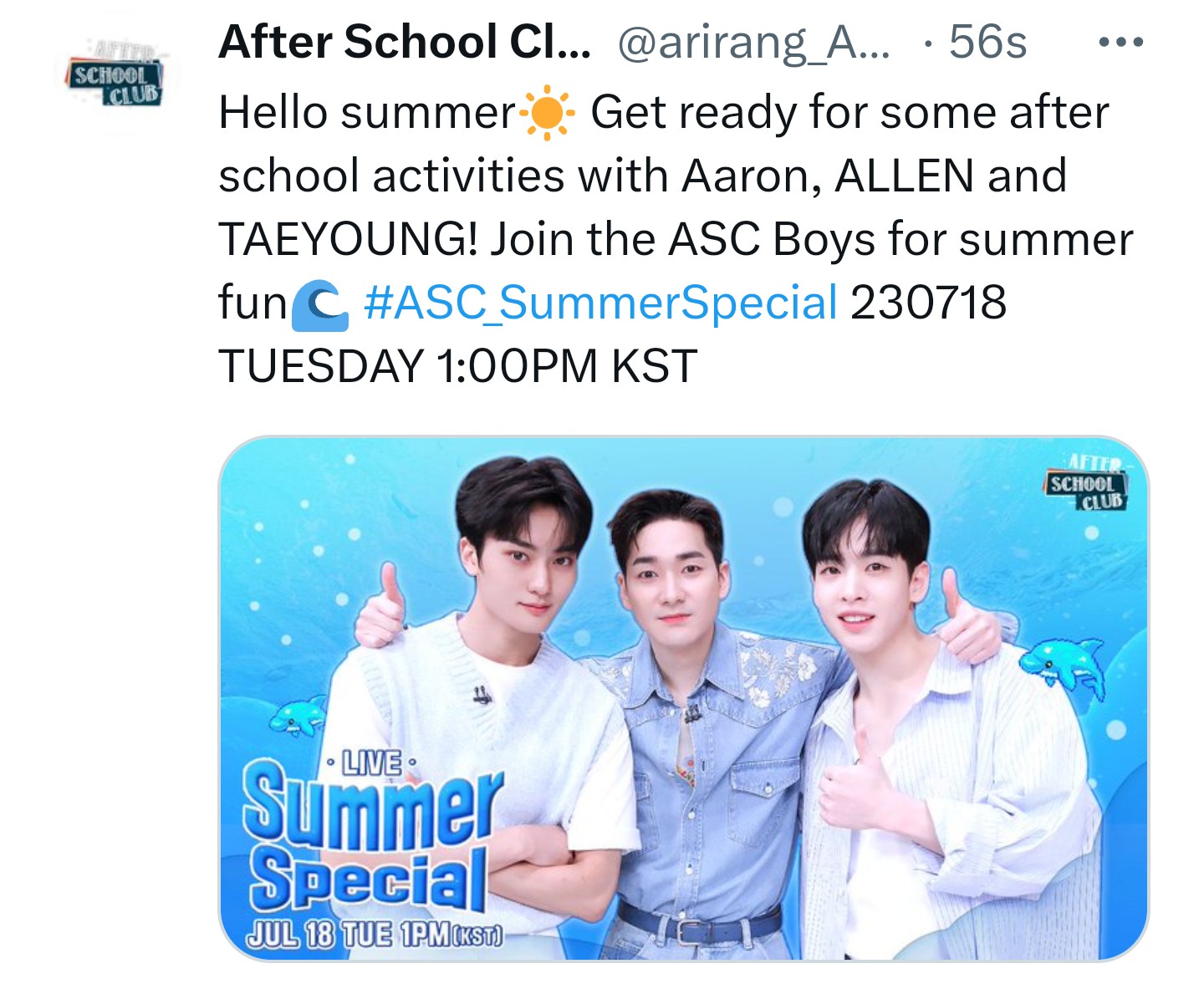Hello summer☀ Get ready for some after school activities with Aaron, ALLEN and TAEYOUNG! Join the ASC Boys for summer fun🌊 #ASC_SummerSpecial 230718 TUESDAY 1:00PM KST