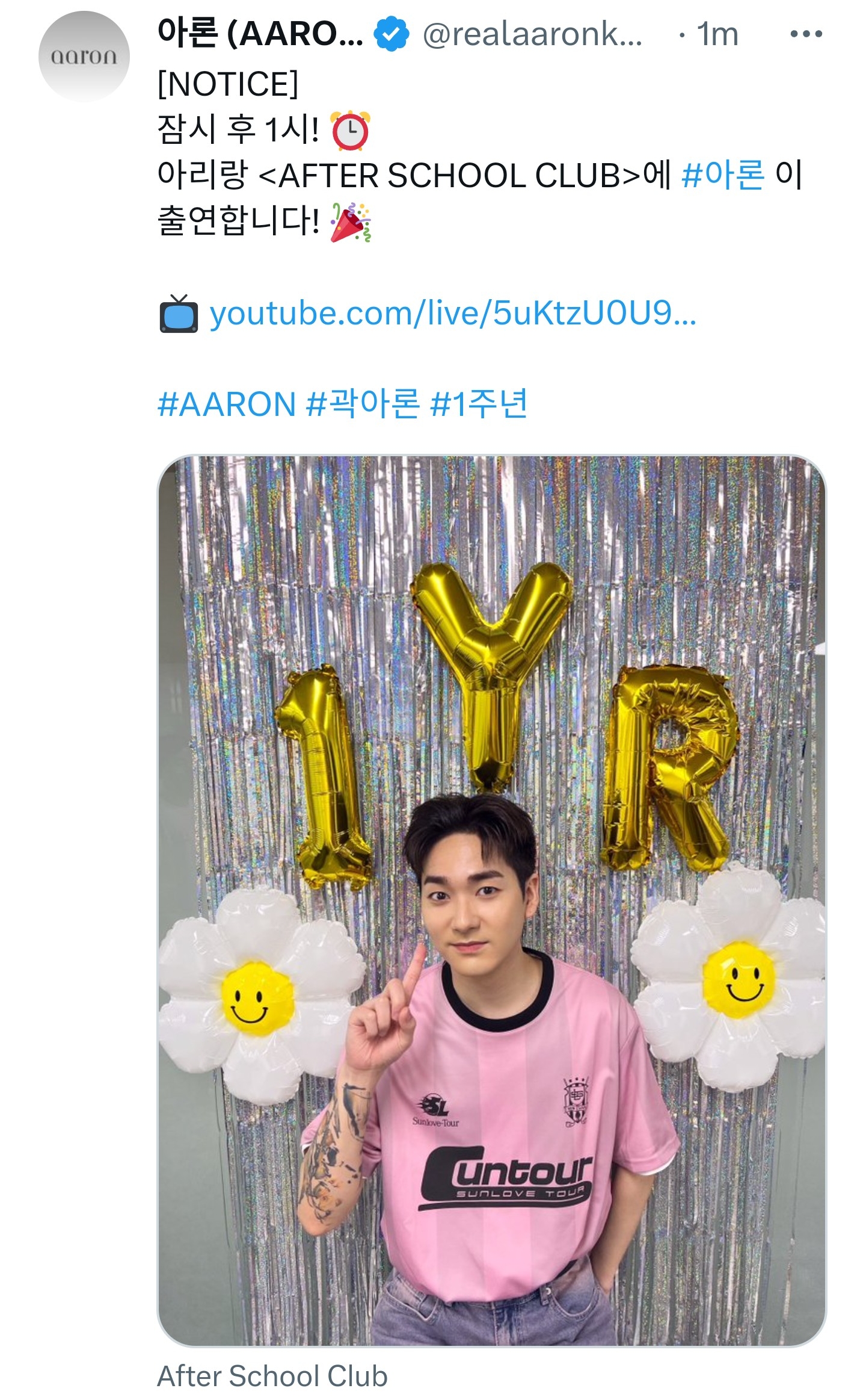 아리랑 <AFTER SCHOOL CLUB>에 #아론 이 출연합니다! 🎉