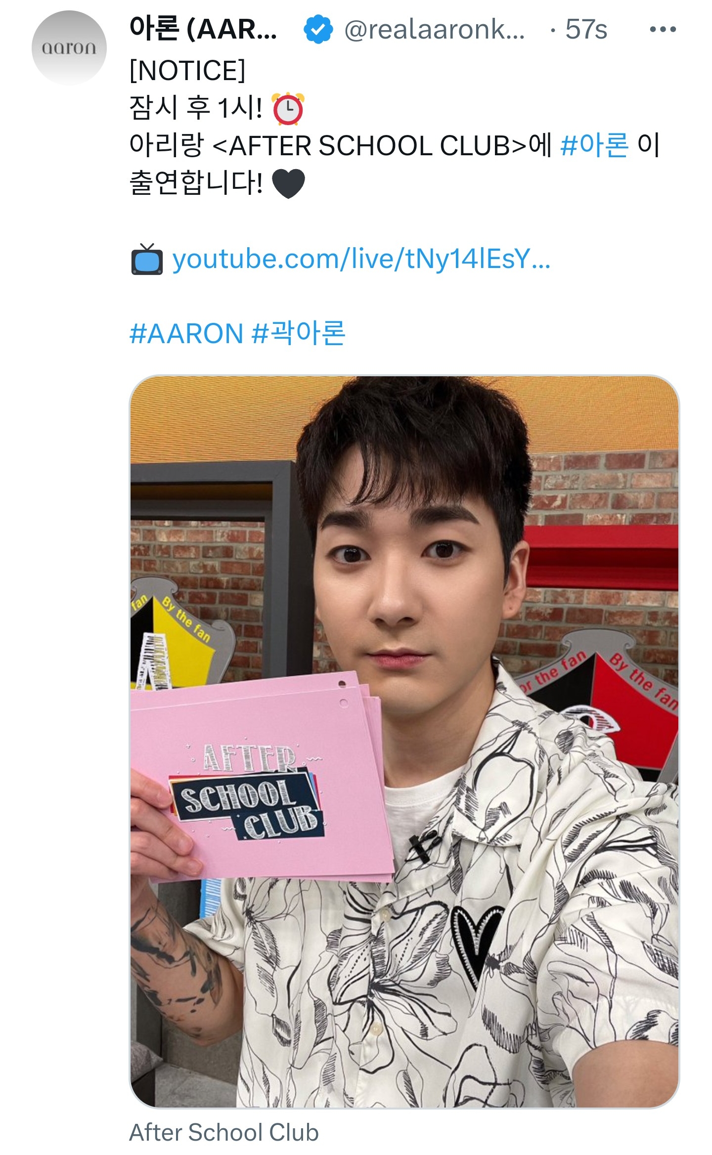 아리랑 <AFTER SCHOOL CLUB>에 #아론 이 출연합니다! 🖤