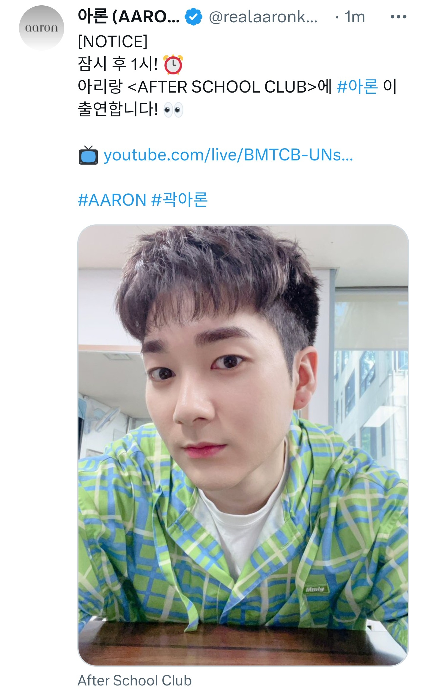 아리랑 <AFTER SCHOOL CLUB>에 #아론 이 출연합니다! 👀