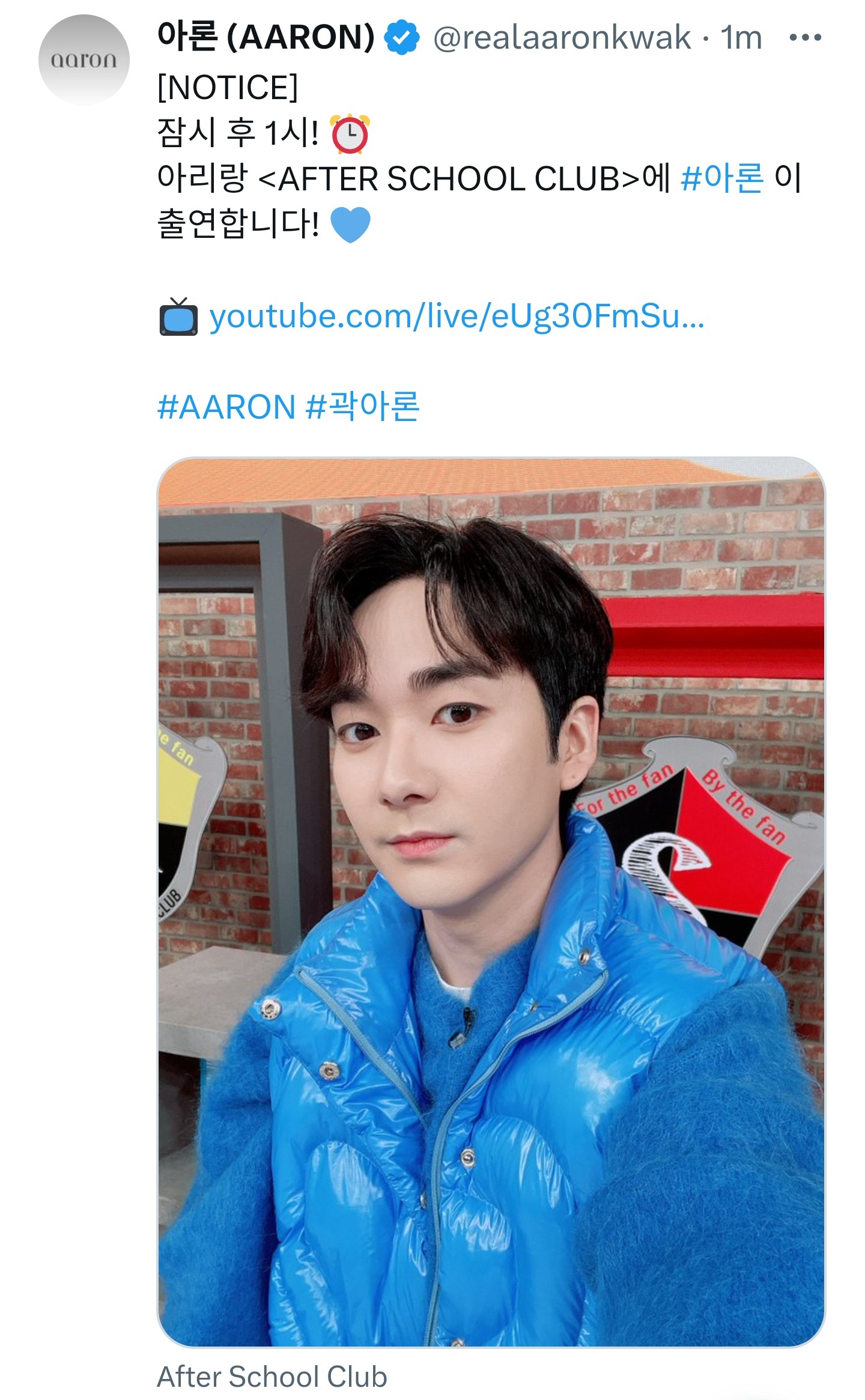 아리랑 <AFTER SCHOOL CLUB>에 #아론 이 출연합니다! 💙