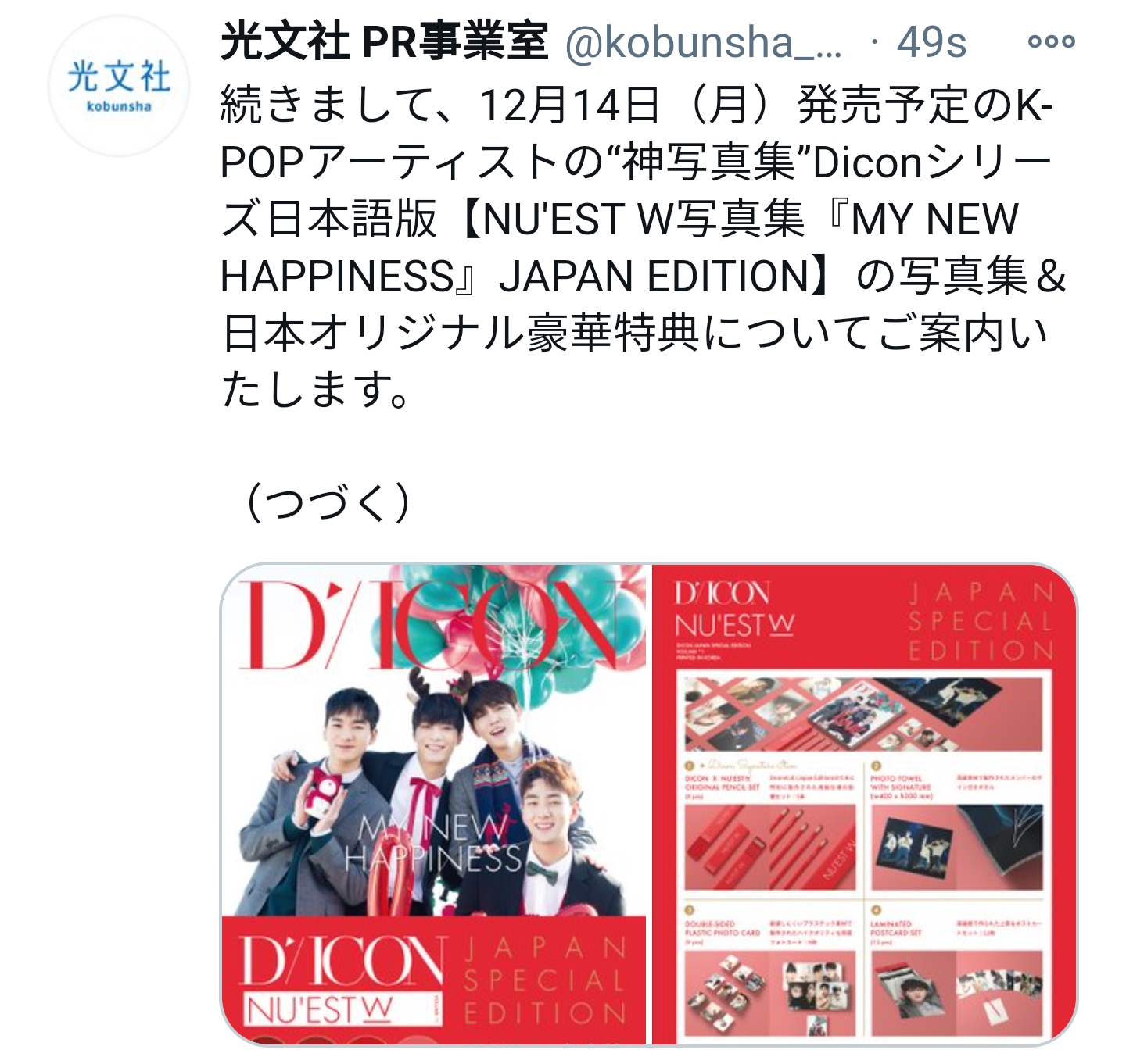 続きまして、12月14日(月)発売予定のK-POPアーティストの“神写真集”Diconシリーズ日本語版【NU'EST W写真集『MY NEW HAPPINESS』JAPAN EDITION】の写真集&日本オリジナル豪華特典についてご案内いたします。