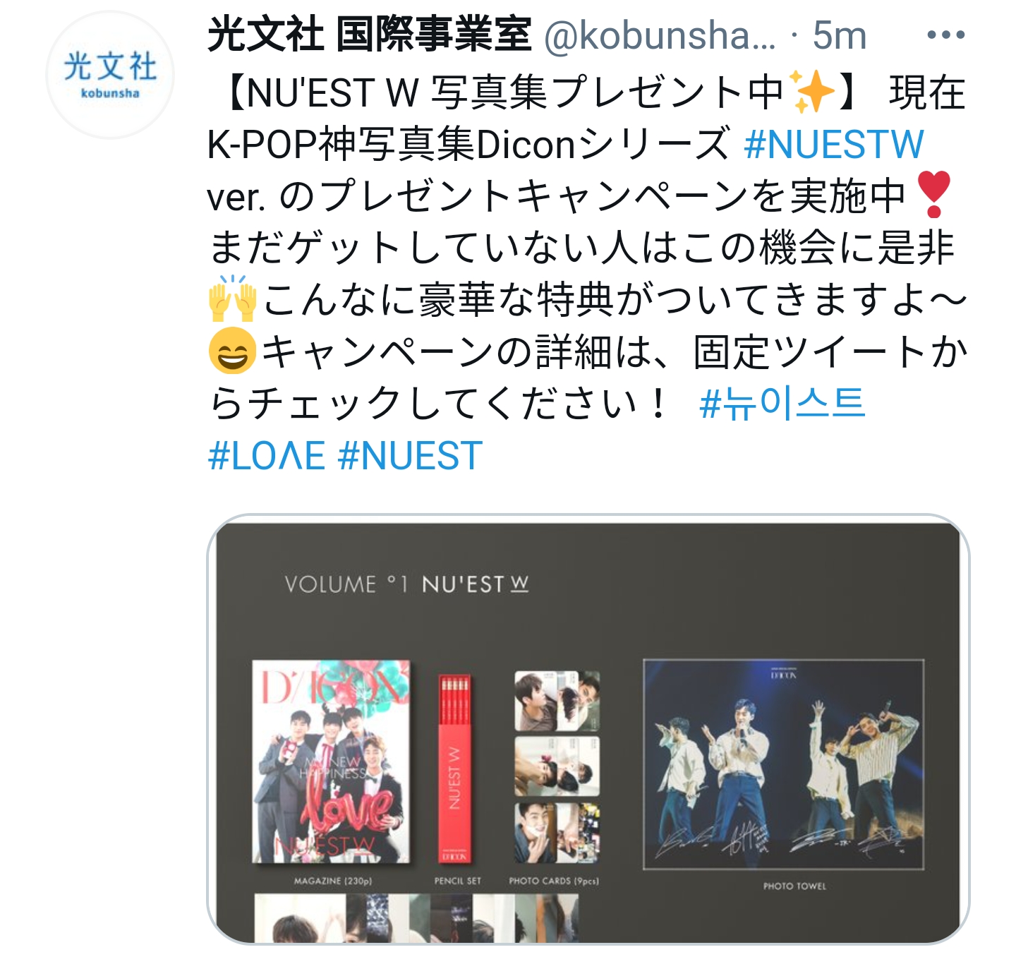 【NU'EST W 写真集プレゼント中✨】 現在K-POP神写真集Diconシリーズ #NUESTW ver. のプレゼントキャンペーンを実施中❣️ まだゲットしていない人はこの機会に是非🙌こんなに豪華な特典がついてきますよ~😄キャンペーンの詳細は、固定ツイートからチェックしてください! #뉴이스트 #LOΛE #NUEST