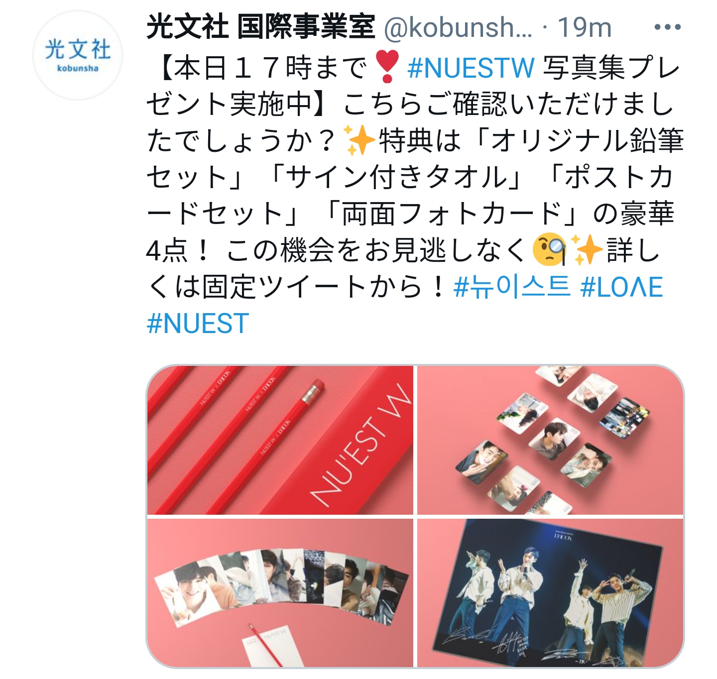 【本日17時まで❣️#NUESTW 写真集プレゼント実施中】こちらご確認いただけましたでしょうか?✨特典は「オリジナル鉛筆セット」「サイン付きタオル」「ポストカードセット」「両⾯フォトカード」の豪華4点! この機会をお見逃しなく🧐✨詳しくは固定ツイートから!#뉴이스트 #LOΛE #NUEST
