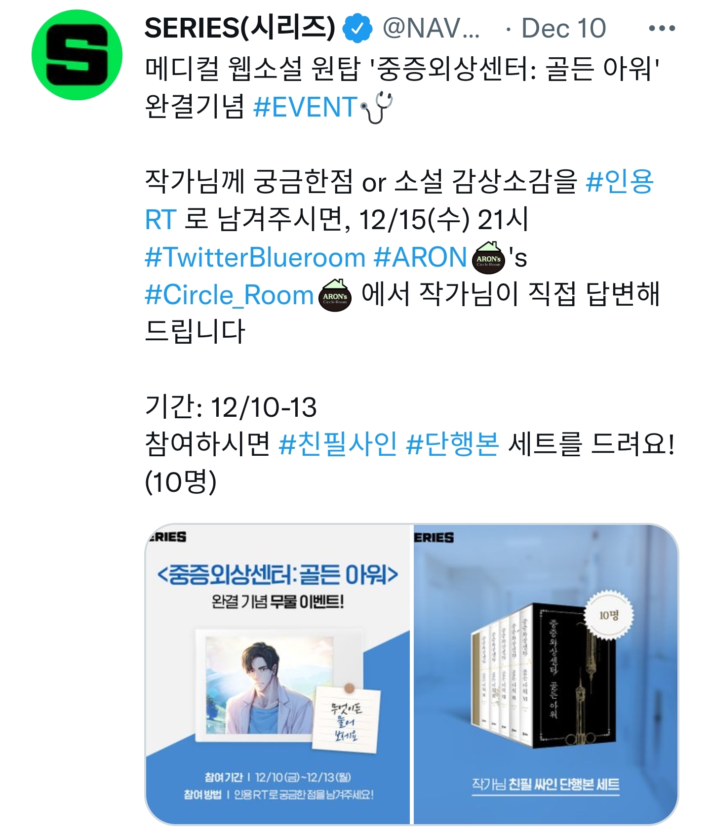 작가님께 궁금한점 or 소설 감상소감을 #인용RT 로 남겨주시면, 12/15(수) 21시 #TwitterBlueroom #ARON's #Circle_Room 에서 작가님이 직접 답변해드립니다